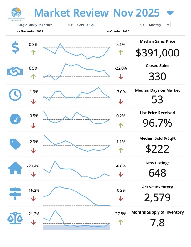 ✅ Takeaway: The Cape Coral single-family home market in November 2025 shows solid year-over-year growth in closed sales and stable pricing with a slight increase in median sales price. Active inventory has decreased significantly year-over-year, and the months of supply has dropped substantially, indicating a competitive market. Homes are selling quickly and close to asking price, demonstrating strong demand and market efficiency.