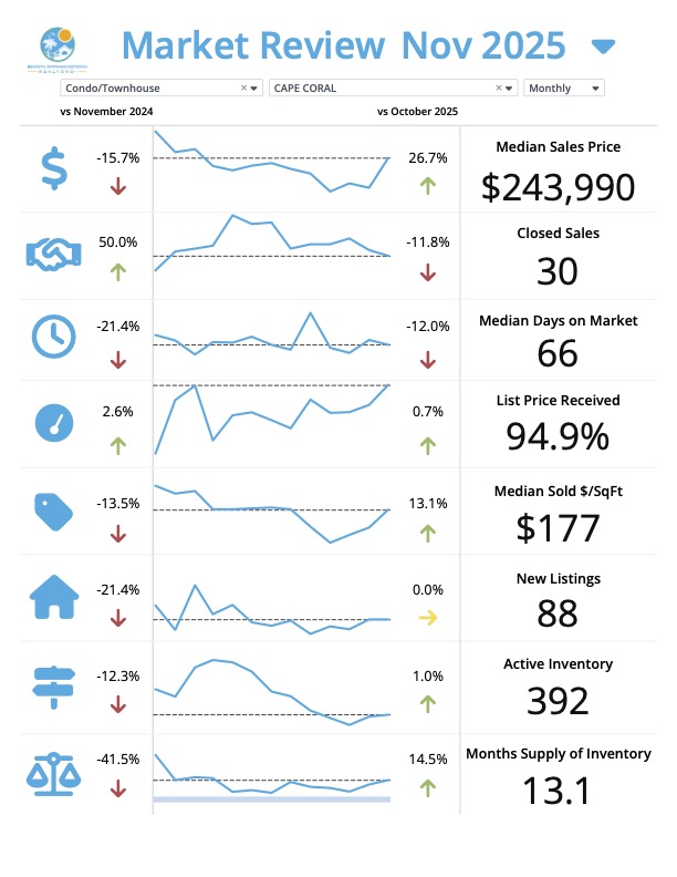 ✅ Takeaway: The Cape Coral condo and townhouse market in November 2025 experienced remarkable growth in closed sales, up 50% year-over-year. While median sales price and price per square foot declined from last November, properties are selling faster than last year. The significant reduction in months of supply and decreased active inventory indicate a tightening market that's becoming increasingly competitive for buyers despite the price adjustments.
