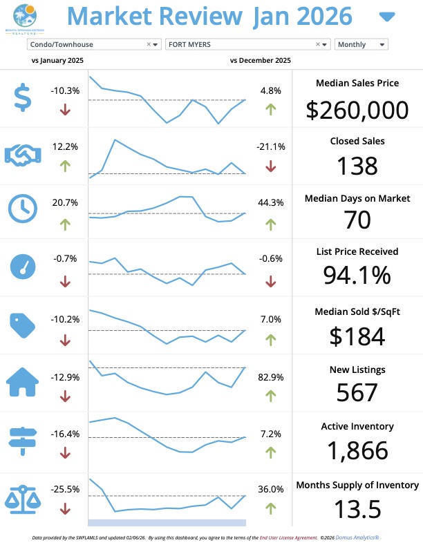 โ Takeaway: The Fort Myers condo and townhouse market in January 2026 is a buyer's market, with a significant increase in new listings and months of supply. This is a great time for buyers to find a deal.