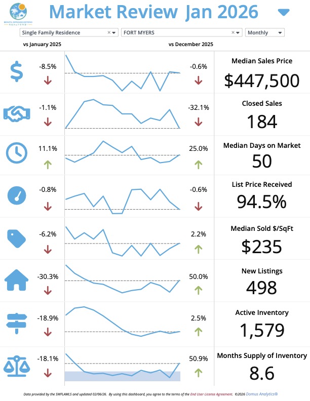 โ Takeaway: The Fort Myers single-family home market in January 2026 shows a decrease in closed sales and median sales price. However, new listings and months of supply are up, indicating a shift towards a buyer's market.