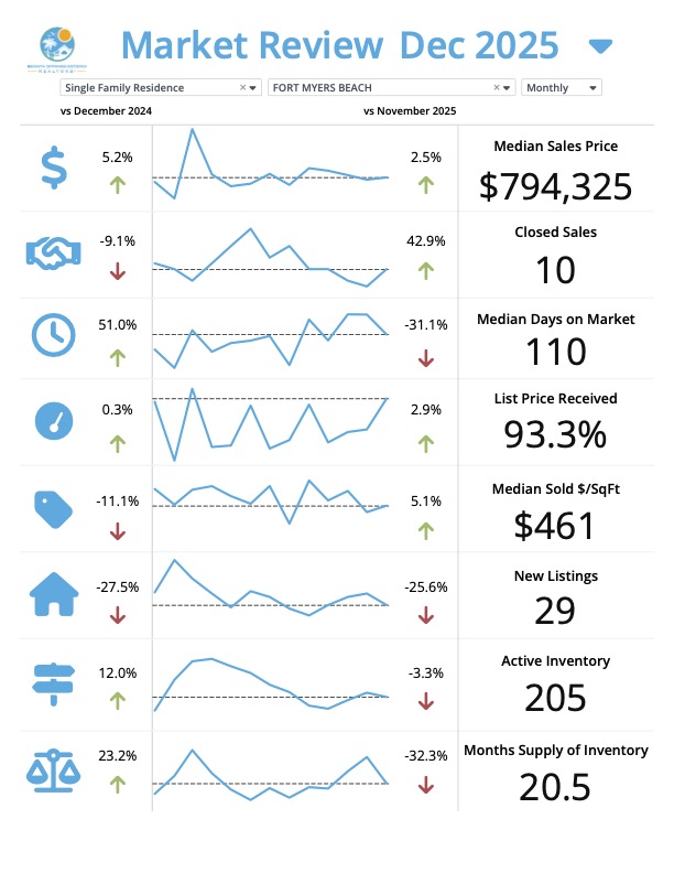 โ Takeaway: The Fort Myers Beach single-family home market in December 2025 is seeing a healthy increase in sales and median sales price compared to last month. This indicates a strong demand for homes in this area.