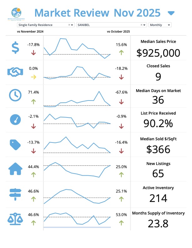โ Takeaway: The Sanibel single-family home market in November 2025 shows stable sales volume year-over-year but a significant decrease in median sales price and price per square foot. Active inventory has increased substantially, and the months of supply has risen dramatically, indicating a shift toward a buyer's market with more options and negotiating power for purchasers.