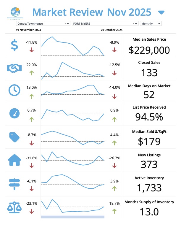 ๐ Fort Myers – Condos & Townhouses (November 2025 vs 2024)