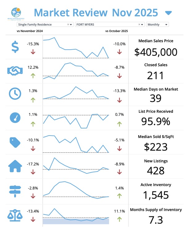 โ Takeaway: The Fort Myers single-family home market in November 2025 shows increased sales activity year-over-year but significant price adjustments. The median sales price and price per square foot have declined substantially from last November, while active inventory has decreased slightly. The months of supply has improved for sellers, and the strong list-to-sale ratio indicates homes are still selling close to asking price despite the price corrections.
