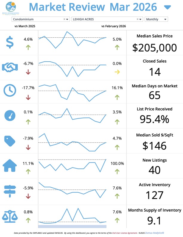 Takeaway: The condo market in Lehigh Acres is seeing higher Median Sales price. Closed sales are down 6.7% year-over-year, while active inventory has dropped by 5.9%. This combination of increased demand and reduced supply has driven the months supply up to 9.1 months.
