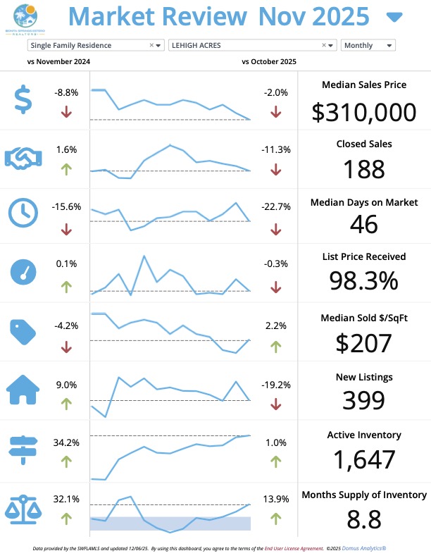 โ Takeaway: The Lehigh Acres single-family home market in November 2025 shows stable sales volume year-over-year with a slight increase in closed sales. However, active inventory has grown significantly, and the median sales price has declined from last November. Despite the price adjustment, homes are selling faster than last year with an excellent list-to-sale ratio, indicating that properly priced homes are moving efficiently in this expanded inventory environment.