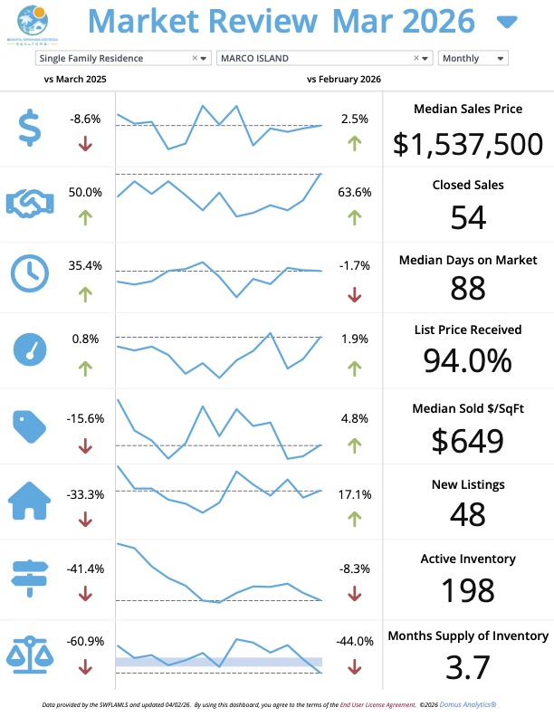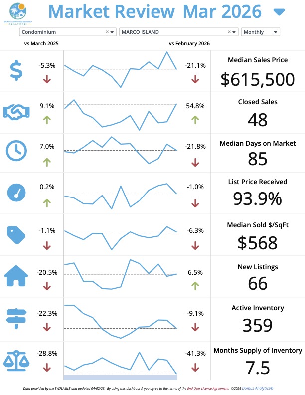 Takeaway: The condo market in Marco Island is seeing a strong surge in activity. Closed sales are up 9.1% year-over-year, while active inventory has decreased by 22.3%. This combination of increased demand and reduced supply has driven the months supply down to 7.5 months. This is a great opportunity for sellers to capitalize on the heightened buyer interest.