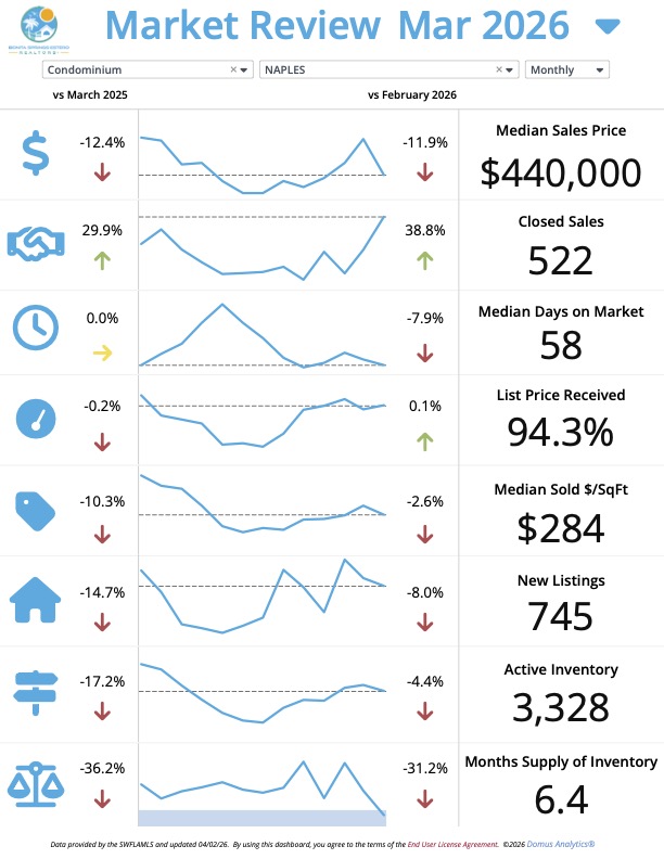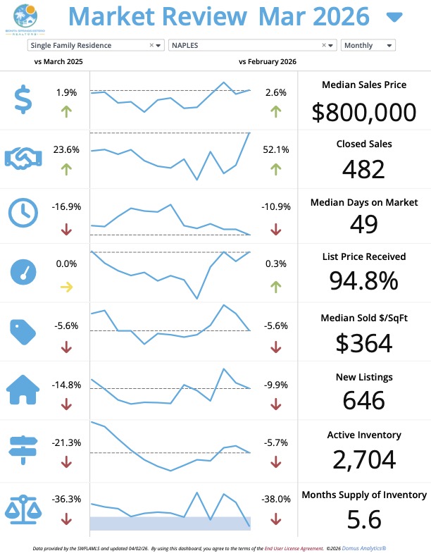 The Naples market is showing clear signs of tightening inventory across both single-family homes and condos. With active listings down significantly, buyers are facing less competition, which is driving up sales activity with prices that are down significantly in price in the condo sector. For buyers in the Single Family home market, inventory is down over 20% and median sales price is up. For sellers, this reduced inventory presents a favorable environment to list your property. For buyers, it's crucial to have a knowledgeable agent to help you navigate this competitive landscape and secure the right home.